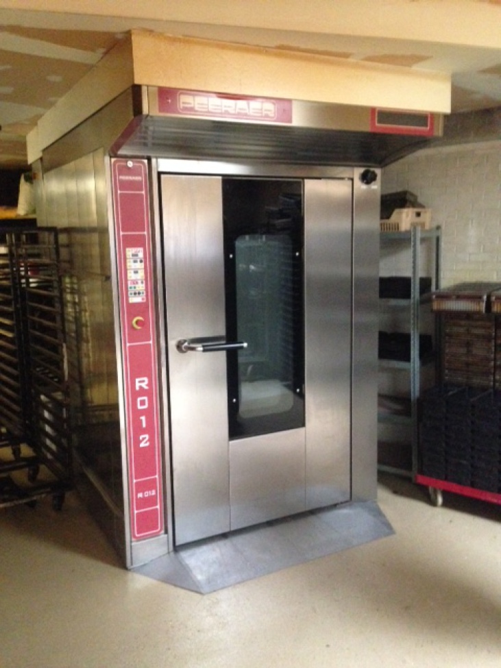 | Het Broodpaleis - Noorderwijk: topklasse met design Twee PEERAER-rotatieovens met twee afzonderlijke PEERAER-remrijskasten. Volledige koelcellen geschikt voor 6 wagens.De ovens zijn van het type R12 waar karren van 80/100 kunnen ingereden worden. Tevens werden er 2 afzonderlijk te bedienen remrijskasten geplaats elk geschikt voor 3 wagens achter mekaar in te rijden. De ovens zijn uitgerust met een microprocessor-besturing waarin 99 bakprogramma's op een eenvoudige wijze kunnen ingesteld worden. Tevens is er steeds de mogelijkheid om manueel te bakken. Ook tijdens de looptijd van het automatisch programma kan men nog wijzigingen aanbrengen in de ingestelde parameters. Kortom zeer gebruiksvriendelijke ovens en remrijskasten toepasbaar in iedere bakkerij. |